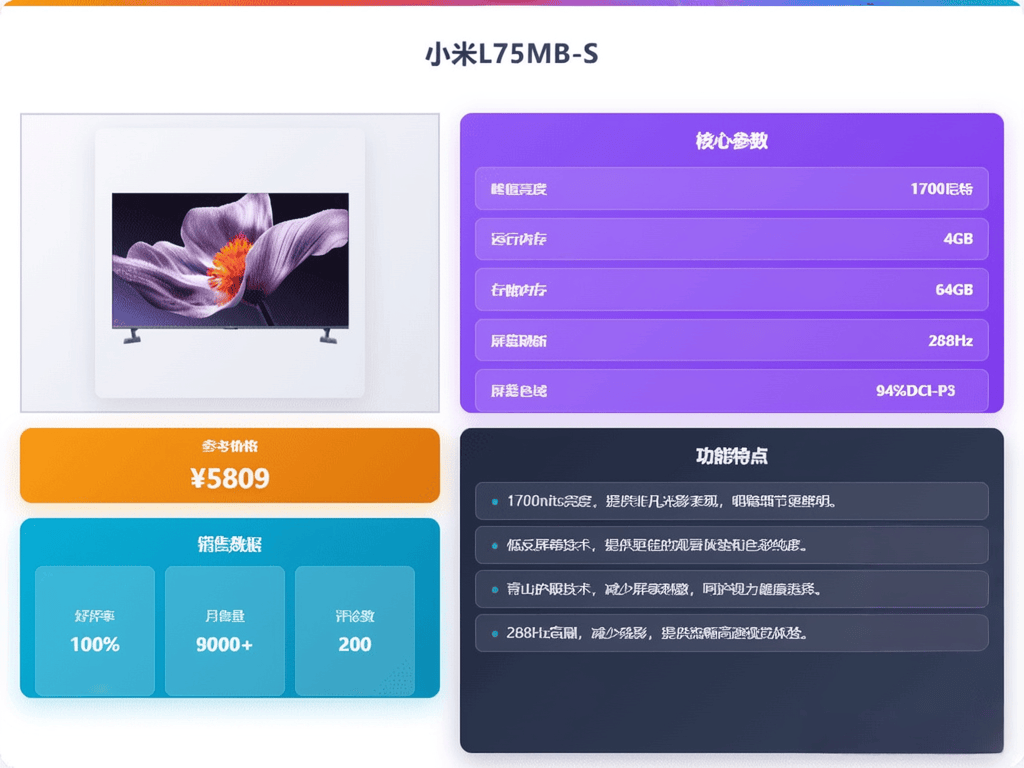 在选购小米75寸电视时,首先要明确自己的预算和对画质的需求。如果预算充足,追求极致的画质体验,那Mini LED系列绝对是首选。Mini LED技术带来的高对比度和精准控光,能让画面更生动、细节更丰富。能关注像小米电视S75 Mini LED,或者Redmi X75 2026款,它们的背光分区更多,亮度更高,色彩表现也更出色,带来的视觉上的冲击力更强。