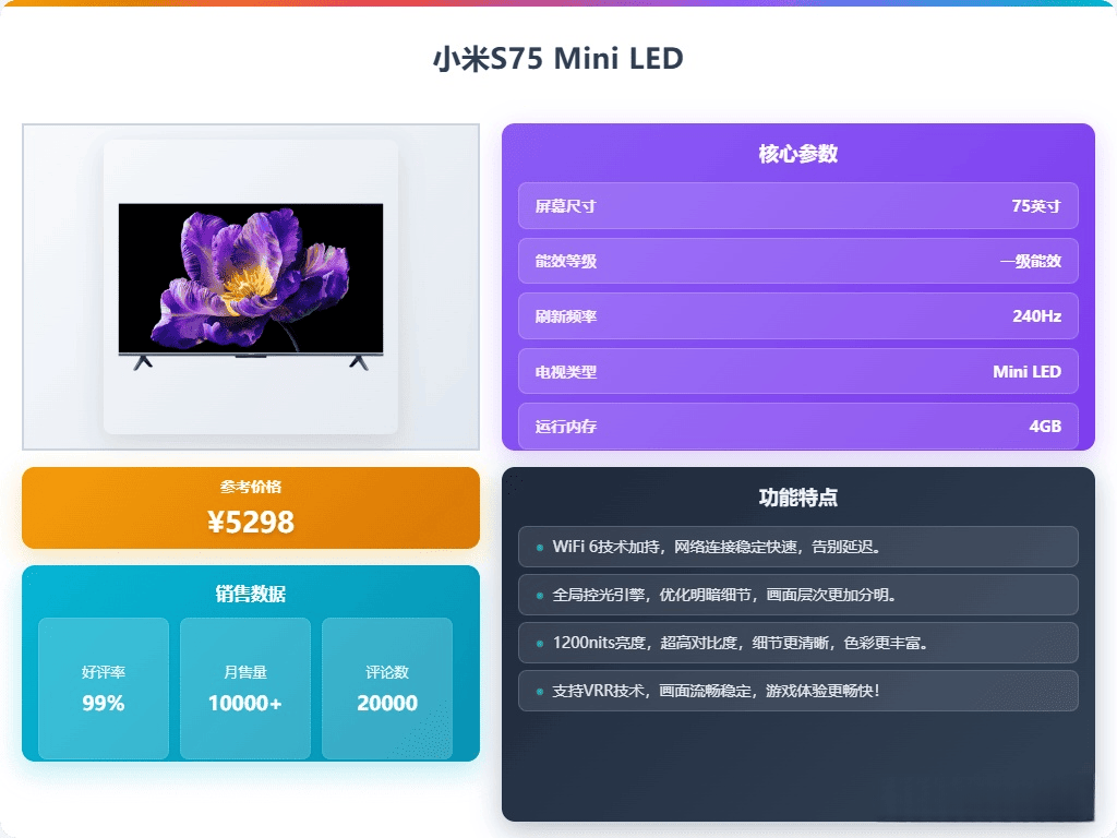 写在最后,总的来说,小米75寸电视的选择还是挺多的,能够准确的通过自己的预算和需求来做出合理的选择。Mini LED系列在画质上更胜一筹,适合追求极致体验的用户;而普通LED电视则更具性价比,适合预算有限的用户。关注高刷新率、HDMI 2.1接口、护眼模式等参数,能更好地满足多种的使用场景。希望这些建议能帮助你选到心仪的小米75寸电视,享受大屏带来的快乐!返回搜狐,查看更加多